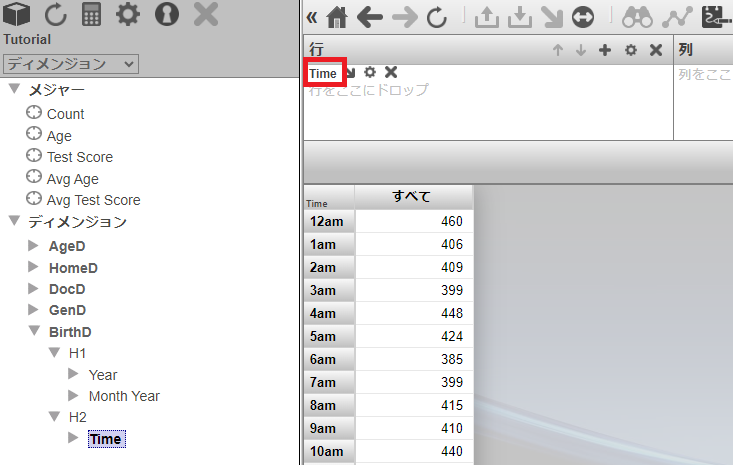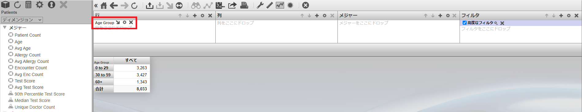 AgeD ディメンジョンの Age Group レベルを [行] に指定し、メジャーの Patient Count、Avg Age、Avg Test Score を [メジャー]に指定します。