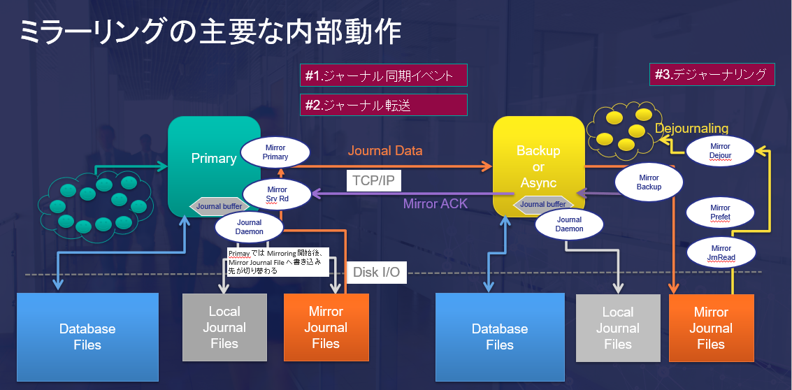 シャドウイングから移行される場合のミラーリングの構成としては、DR非同期またはレポーティング非同期になります。 ミラーリングとシャドウイングでは、データベースファイルやジャーナルファイルの取り扱いが異なります。
