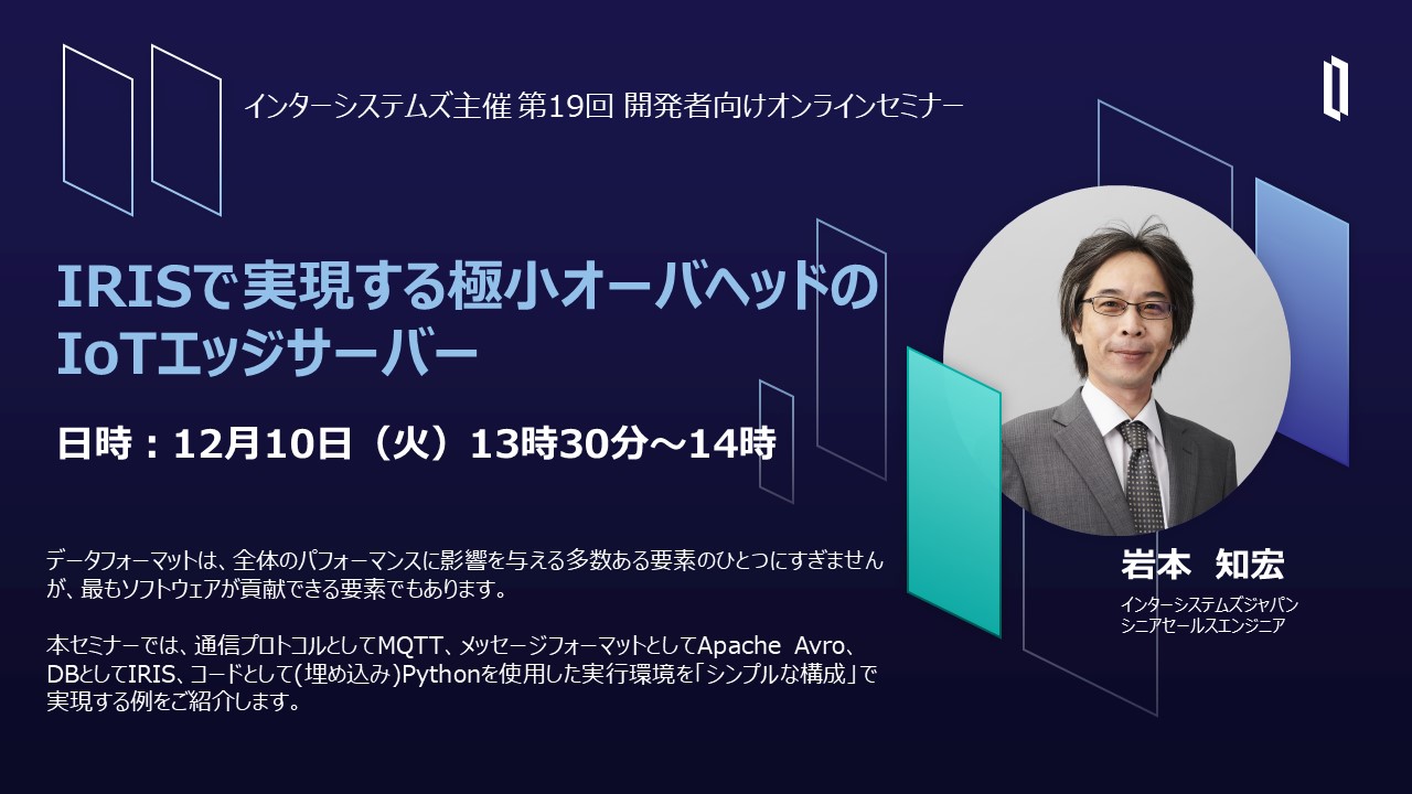 ご好評いただいておりますインターシステムズ開発者向けウェビナー、今年最後の回は以下の通り開催いたします。