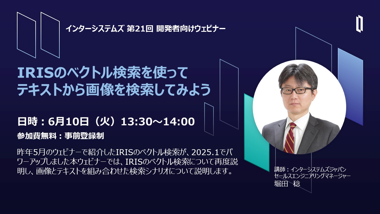 本ウェビナーでは、IRISのベクトル検索について再度説明し、画像とテキストを組み合わせた検索シナリオについて説明します。