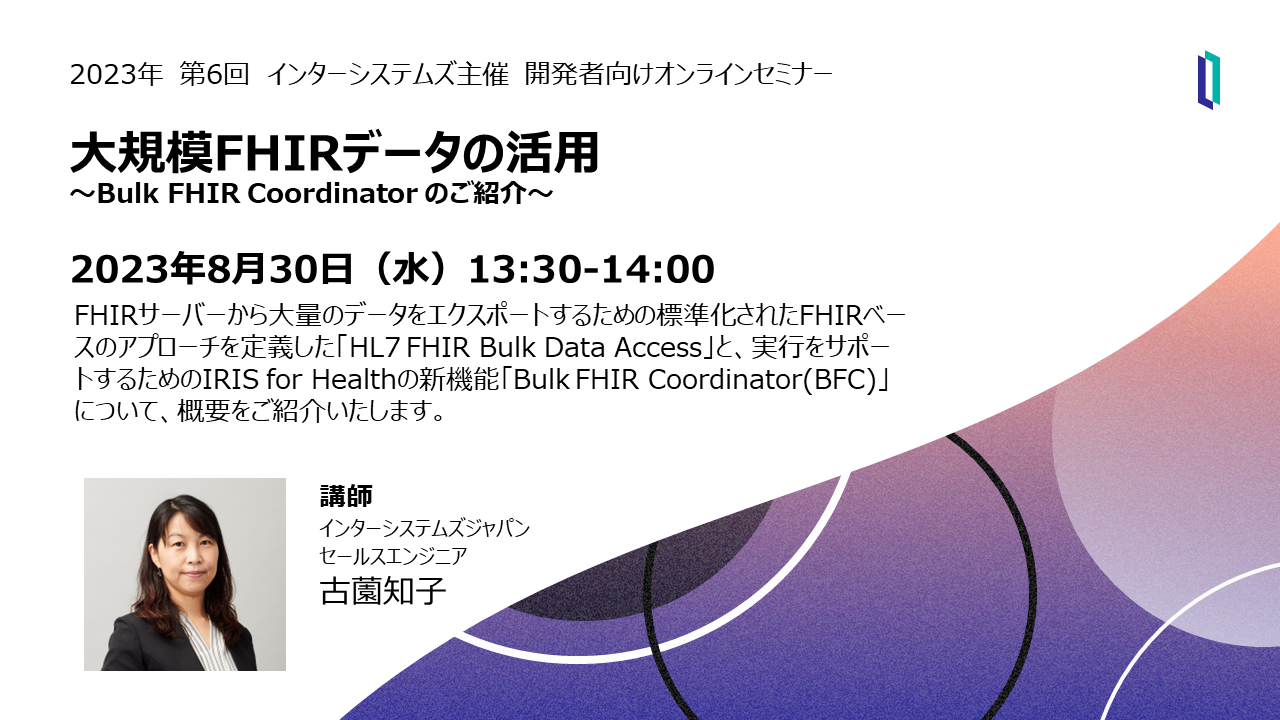 FHIRサーバーから大量のデータをエクスポートするための標準化されたFHIRベースのアプローチを定義した「HL7 FHIR Bulk Data Access」と、この実行をサポートするためのIRIS for Healthの新機能「Bulk FHIR Coordinator(BFC)」について、概要をご紹介いたします。