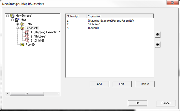 添え字は 3 つ必要なことが分かります。 1 つ目の添え字に手こずる人が多いです。 先ほどお見せした Relationship プロパティは使わず、代わりに親クラスのプロパティを使います。 それを行うには、完全なフィールド構文 {SchemaName.TableName.FieldName} を使います。 今回の例だと、1 つ目の添え字は {Mapping.Example3Parent.ParentId} となり、