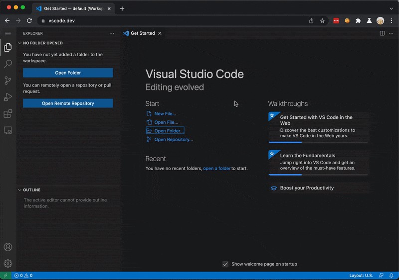 ブラウザで VSCode を実行したくても GitHub リポに関連付けられていない場合には、ローカルフォルダを開くだけのオプションもあります。 https://vscode.dev です。 VSCode-ObjectScript はそこでも利用可能になっています。