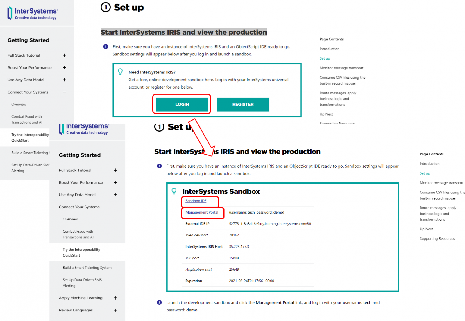 https://gettingstarted.intersystems.com/interoperability/quickstart-interop-2/#set-up のページを開き、Sandboxを開始します。