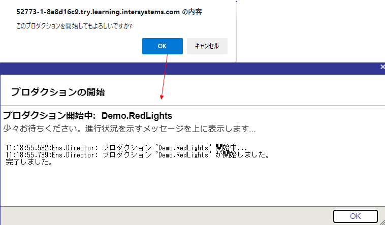 プロダクション開始時「このプロダクションを開始してもよろしいですか?」のポップアップメッセージが表示されるので「OK」をクリックします。
