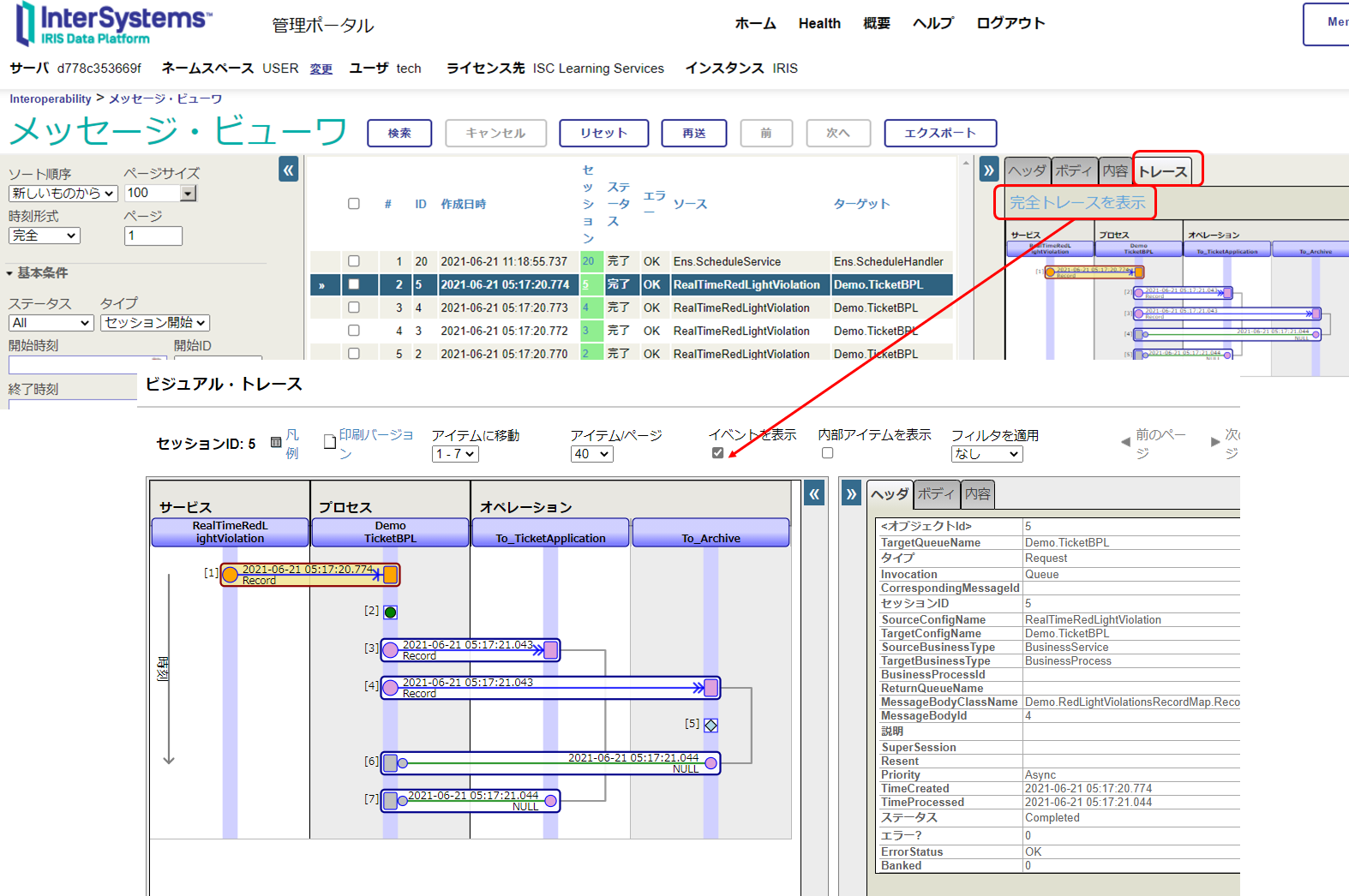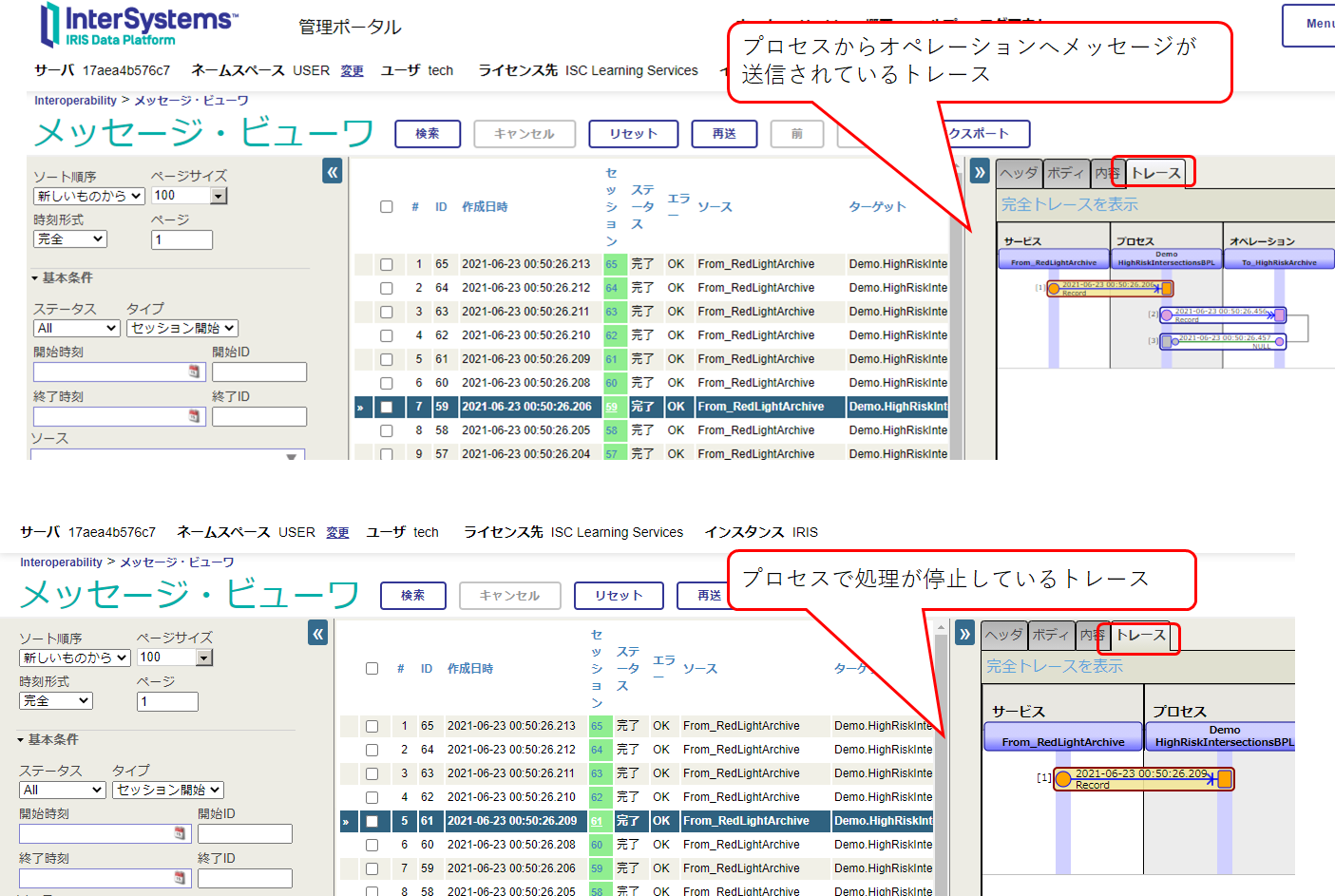 この画面では、IRIS のプロダクションに設定されているコンポーネント間でどのようなメッセージが送受信されているかを確認できます。
