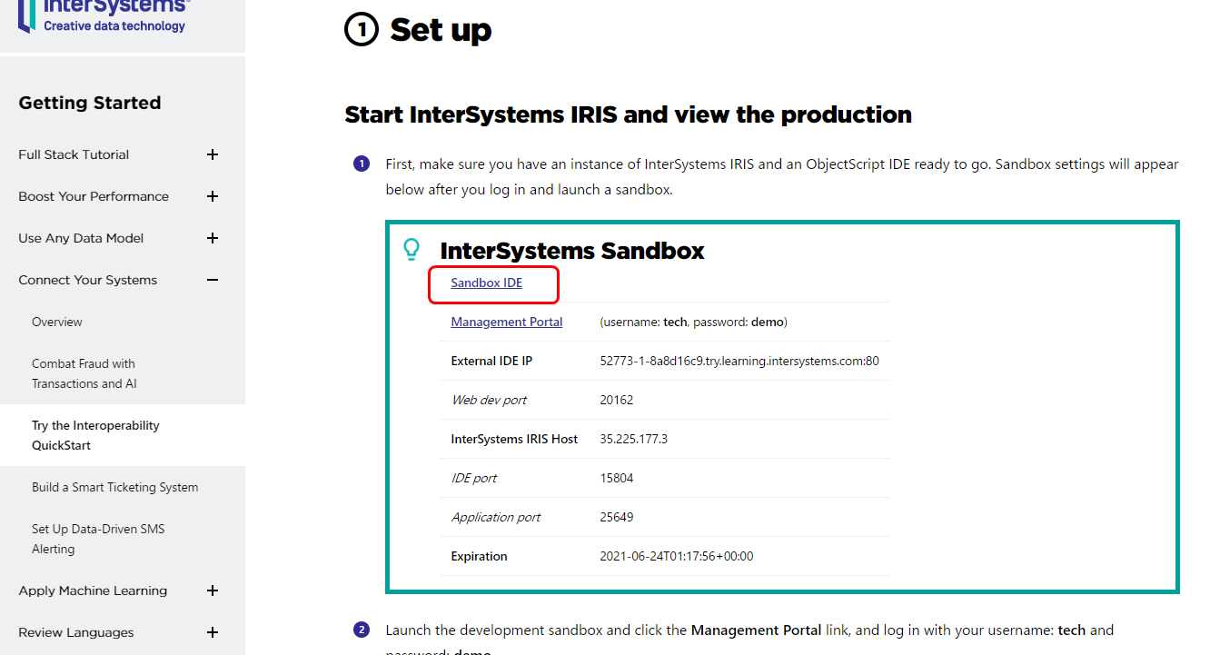 https://gettingstarted.intersystems.com/interoperability/quickstart-interop-2/#set-up を開き「Sandbox IDE」のリンクをクリックします。