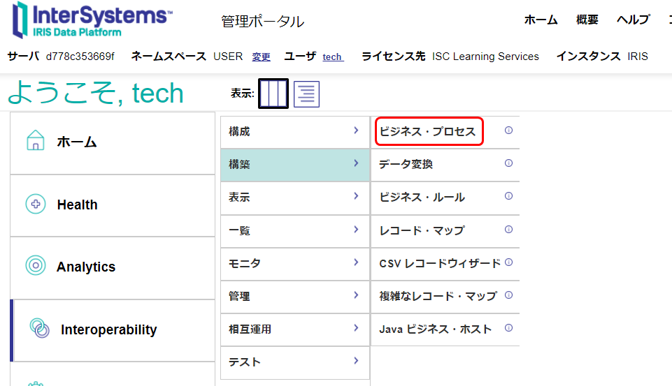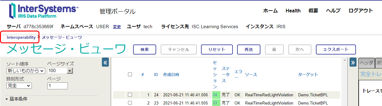 ビジネス・ルールやデータ変換は、InterSystems IRIS の管理ポータルを使用して開発できます。開発の他にも、Interoperability メニューが提供する機能を利用したメッセージのトレースなども確認していく予定です。