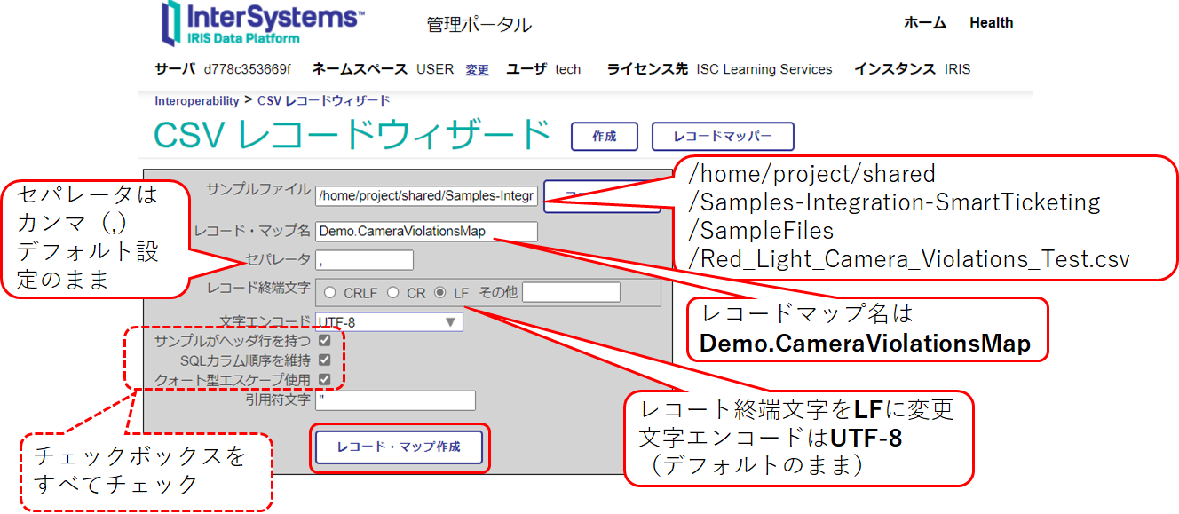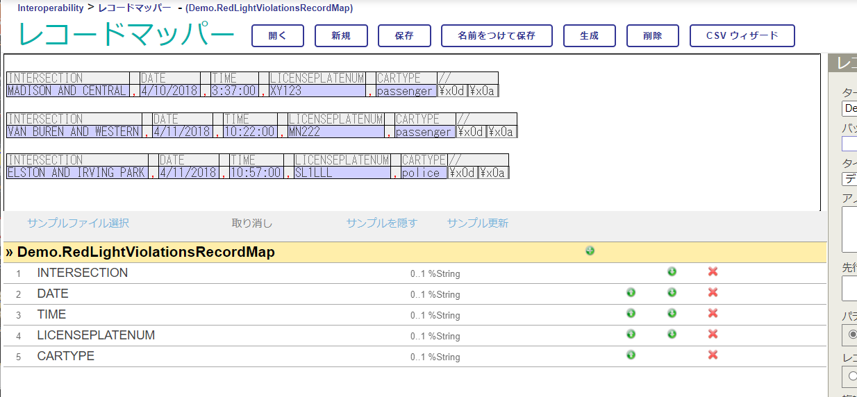 チュートリアルで使用するレコードマップ定義は既に用意されていますが、サンプルの CSV ファイルを使用してCSVファイルのデータがどのように解析されるか、レコードマップ定義のサンプルファイル読み込みオプションを利用して確認します。