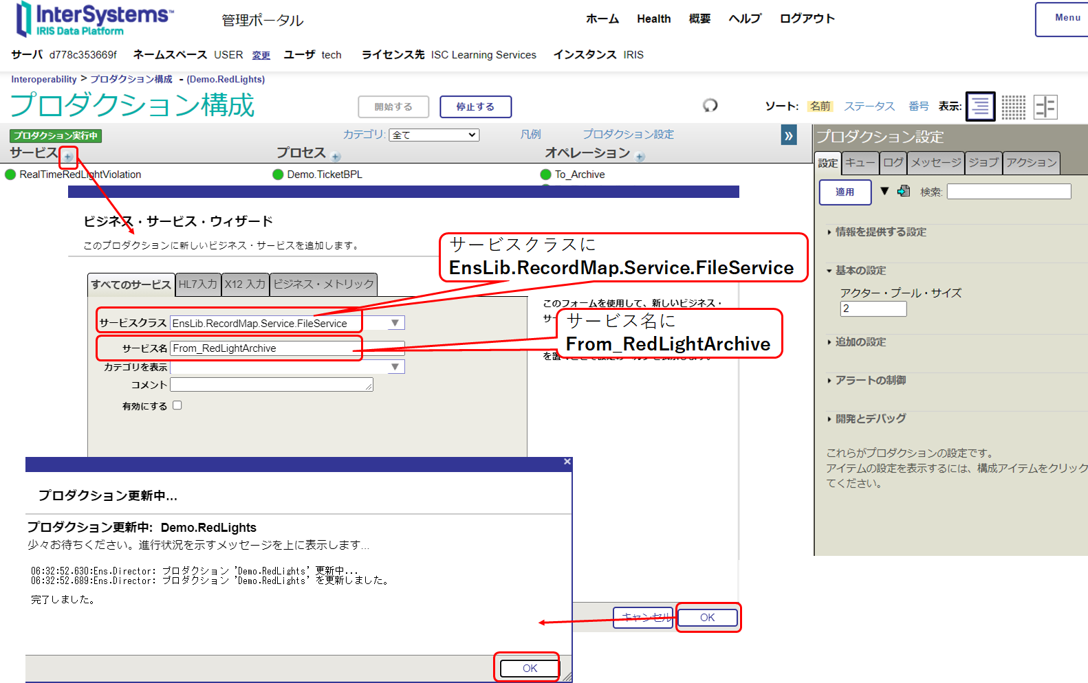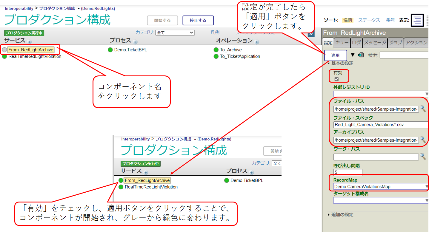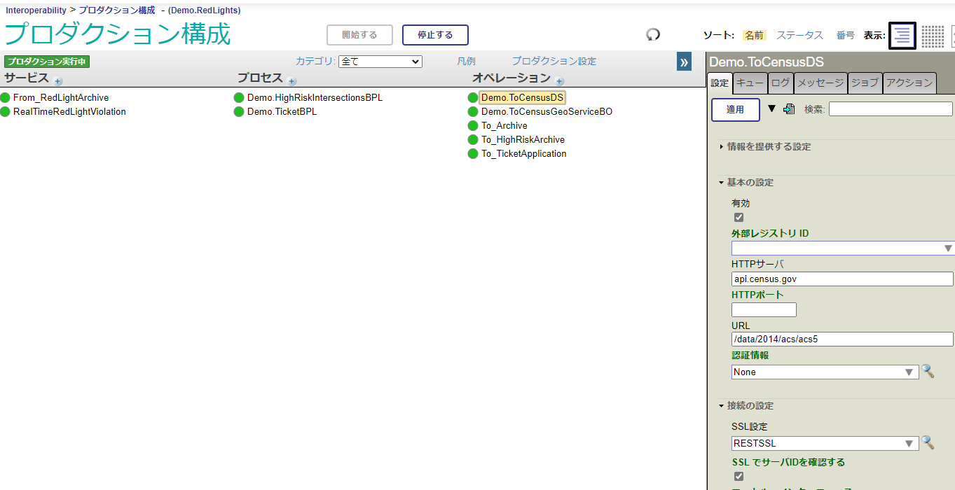 Interoperability > 一覧 > プロダクション > Demo.RedLights の行を選択し「開く」ボタンをクリックします。