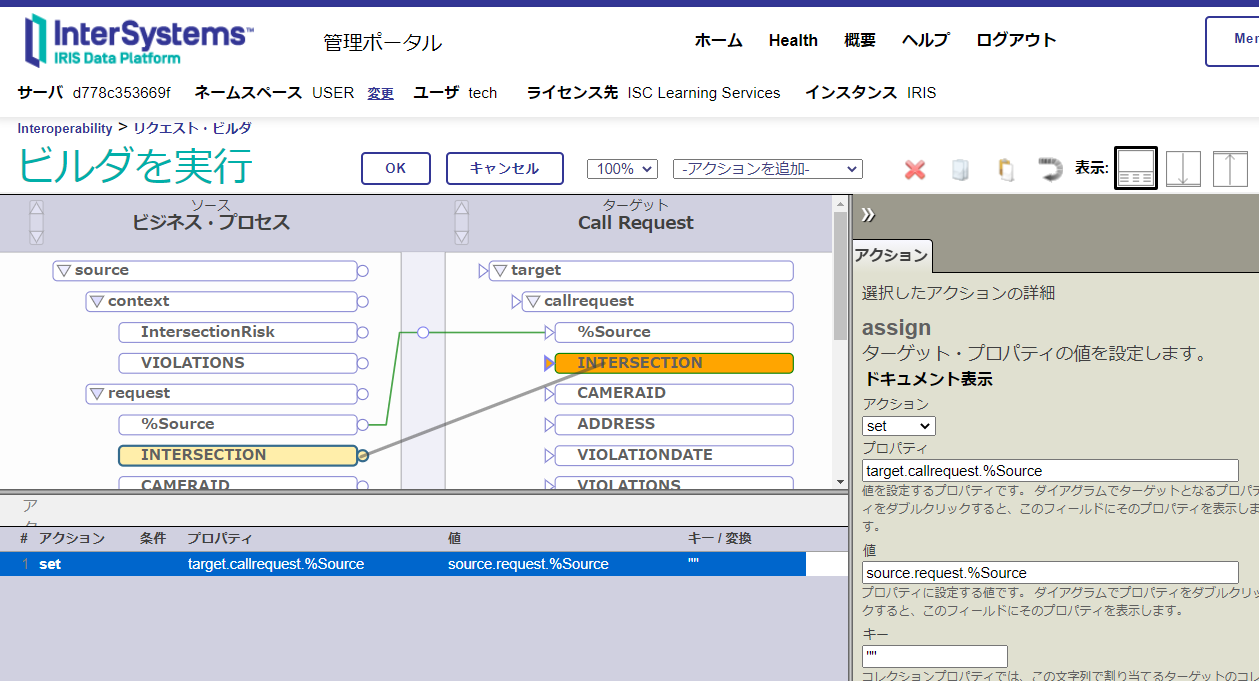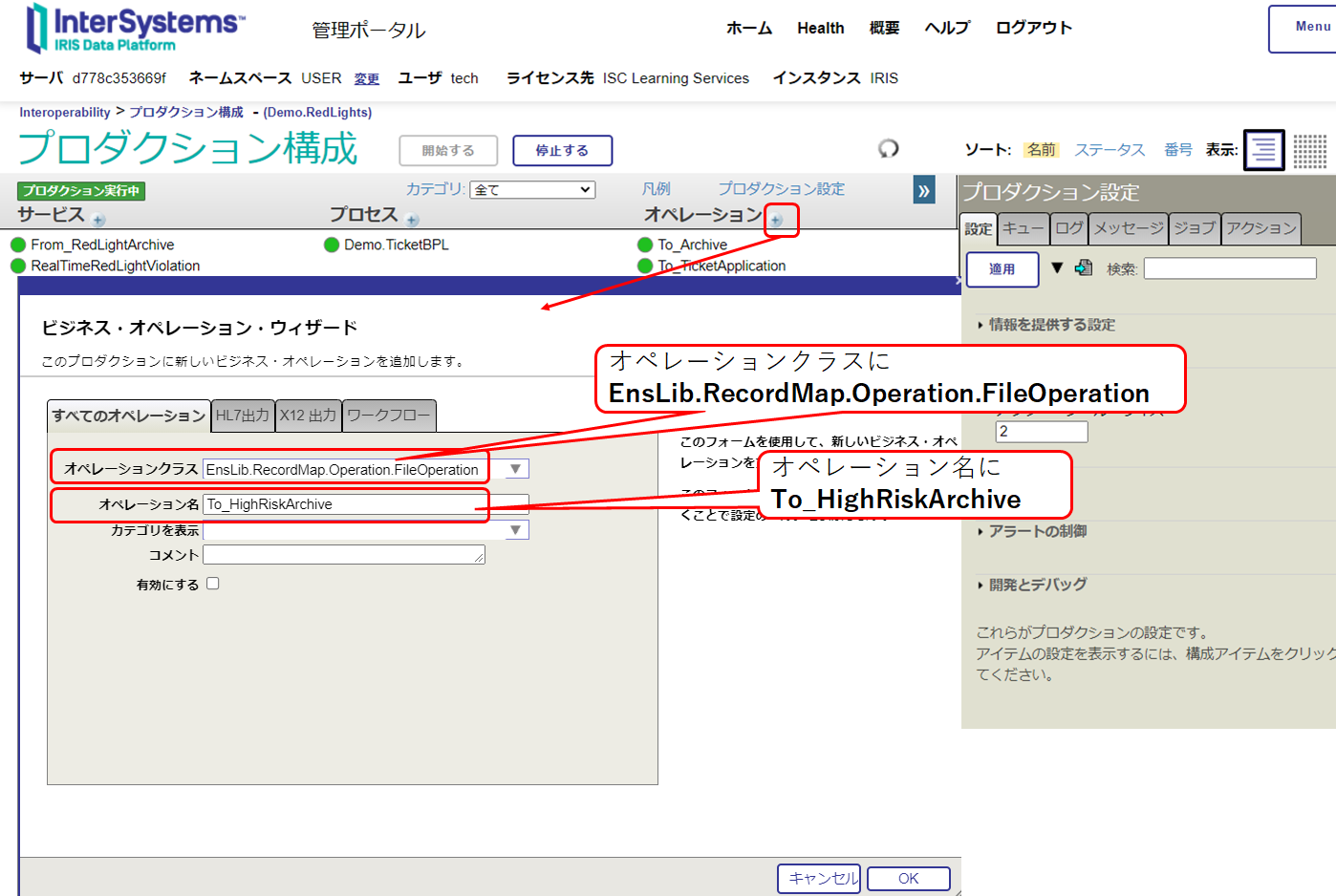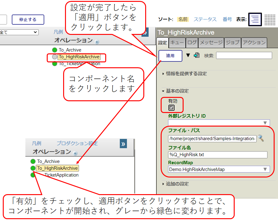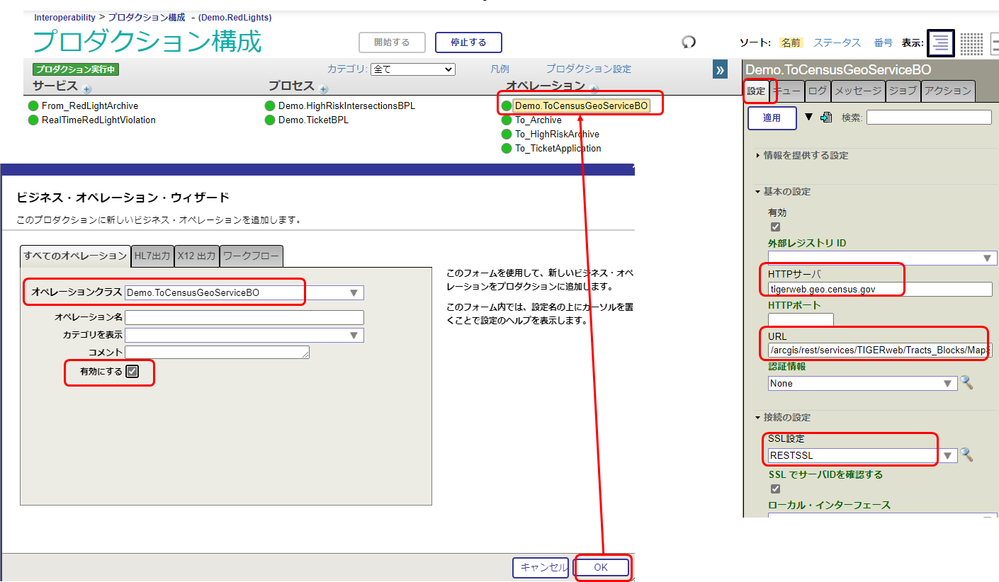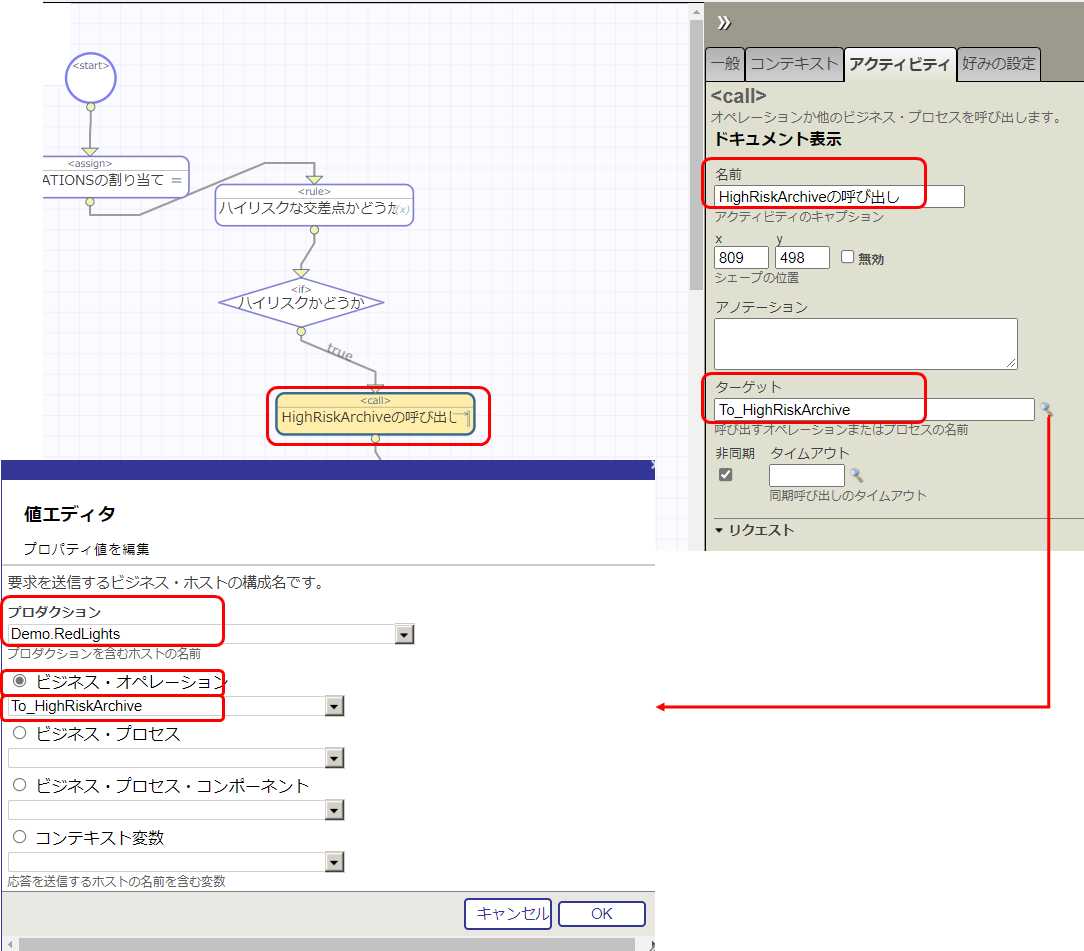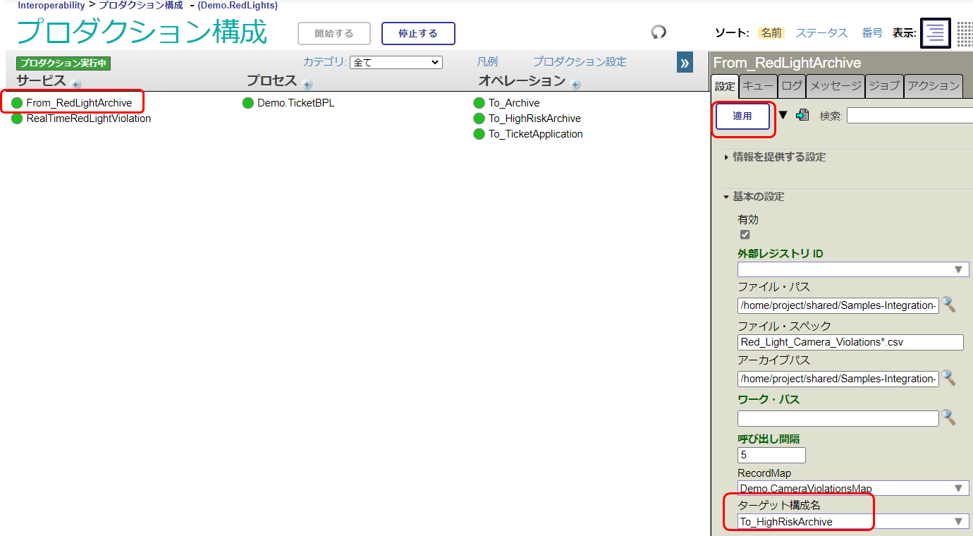 ビジネス・サービス:From_RedLightArchiveの設定タブにある「ターゲット構成名」が正しく設定されているかご確認ください。 チュートリアル前半では、ターゲット構成名には To_HighRiskArchive が設定されています。 チュートリアル公判では、Demo.HighRiskIntersectionsBPL が設定されています。 |