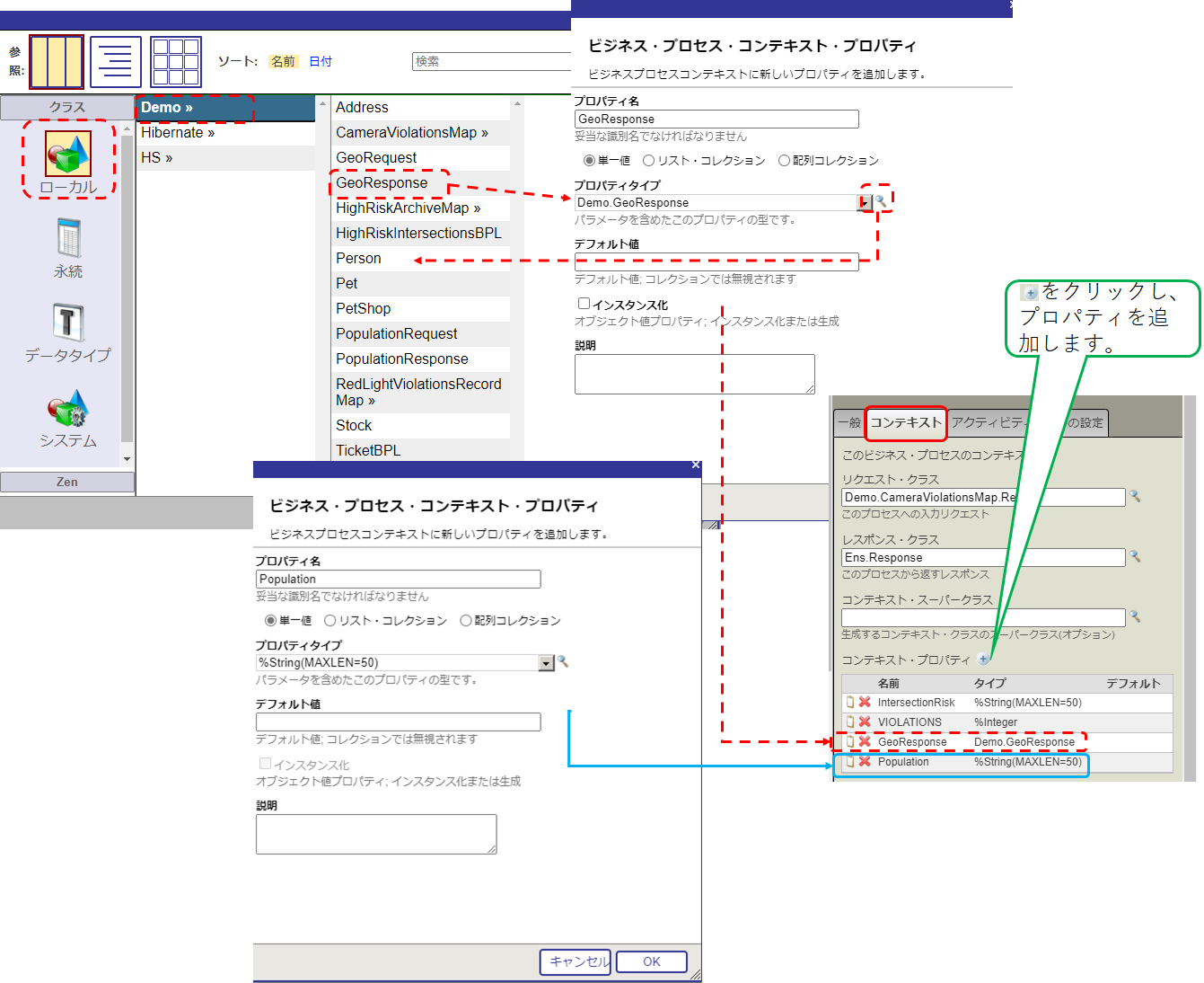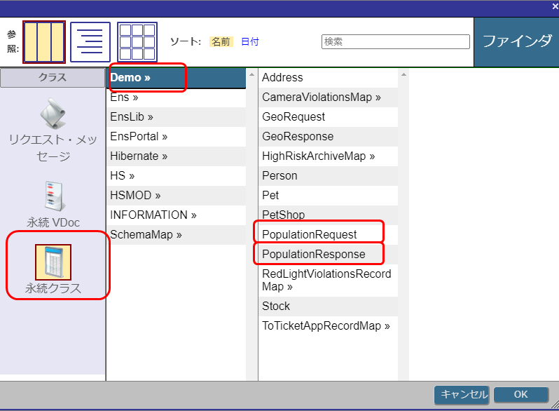 要求メッセージクラスの設定では、永続クラス > Demo > PopulationRequest の順に選択します。