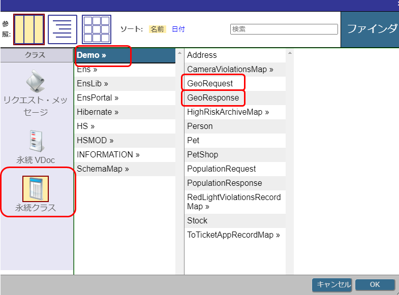 要求メッセージクラスの設定では、永続クラス > Demo > GeoRequest の順に選択します。