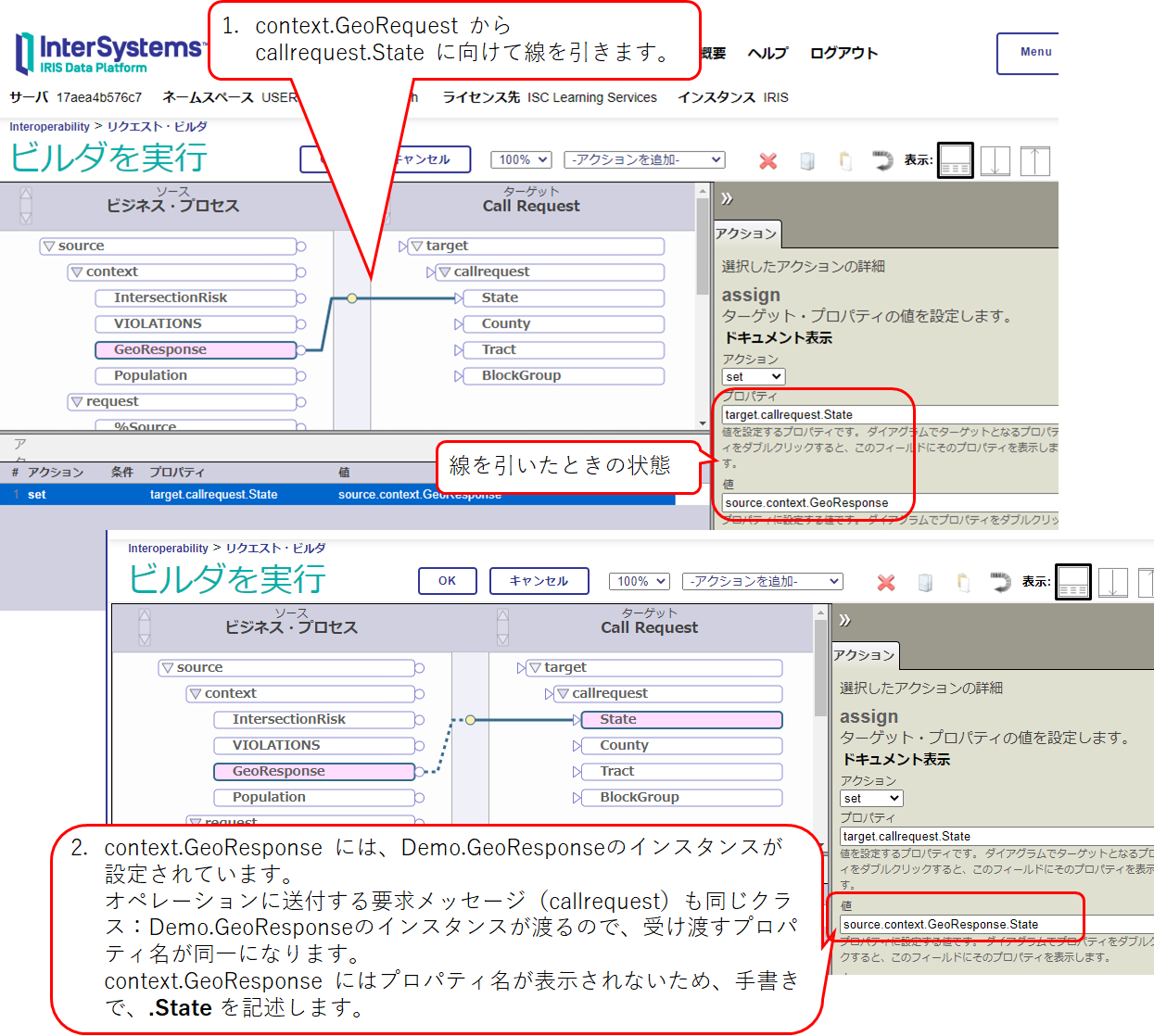 - Demo.GeoResponse のインスタンスを新規生成(set pResponse = ##class(Demo.GeoResponse).%New())している流れでは、HTTP 応答から変換した JSON のダイナミックオブジェクトを使用して、返送データを応答メッセージのプロパティに設定しています。インスタンスを設定している変数 pResponse は、メソッド:GetGeoInfo() の第2引数に参照渡しとして設定されている引数で、この変数に情報を設定することで、ビジネス・オペレーションの応答メッセージとして呼び出し元に返送されます。