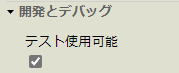 | テストボタンが無効になっていて押せない | プロダクションの設定を確認します。 設定タブの下の方にある「開発とデバッグ」を展開し、テスト使用可能のチェックを入れ 適用ボタンをクリックしてから再度お試しください。 |