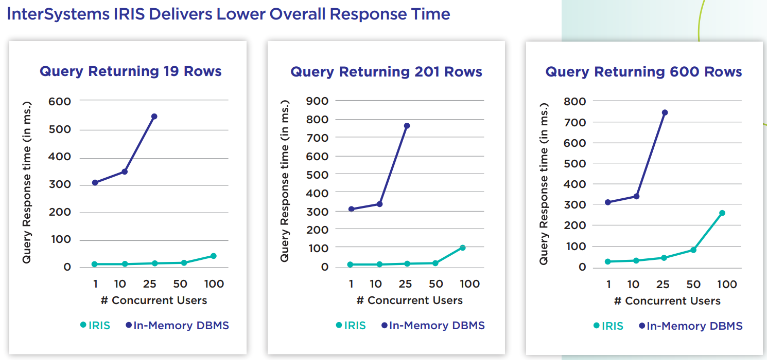 メモリ制限がないため、InterSystems IRISベースのシステムは、取り込み速度や分析ワークロードの予期せぬ急増にも対応でき、ペタバイト規模のデータ処理に拡張可能です。インメモリデータベースではそれができません。