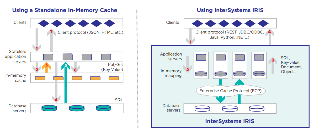 実際、最近の研究論文において、Googleとスタンフォード大学のエンジニアは「[リモート・インメモリ・キーバリューストア]の時代は既に過ぎ去った」と主張しています。その理由として、ドメインに依存しないAPI(例:PUT/GET)が複雑性をアプリケーション側に押し戻し、余分な(アン)マーシャリングのオーバーヘッドやネットワークホップを招くためです。1 InterSystems IRISは、これらのリモートキャッシュ層と比較して優れたパフォーマンスと効率性を提供すると同時に、アーキテクチャおよびアプリケーションの複雑さを低減します