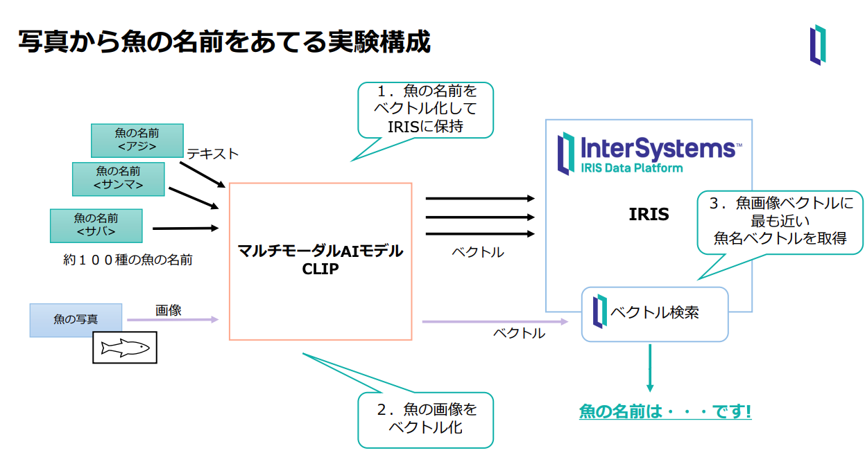 ウェビナー『ベクトルであそぼう!』では、同じく CLIP を利用し、逆にテキストを画像で検索することにより、魚の画像から魚の名前をあてるデモンストレーションをしました。 IRIS にベクトルを格納することで、大規模なデータセットでも高速にベクトル検索が可能となる実験構成で行いました。