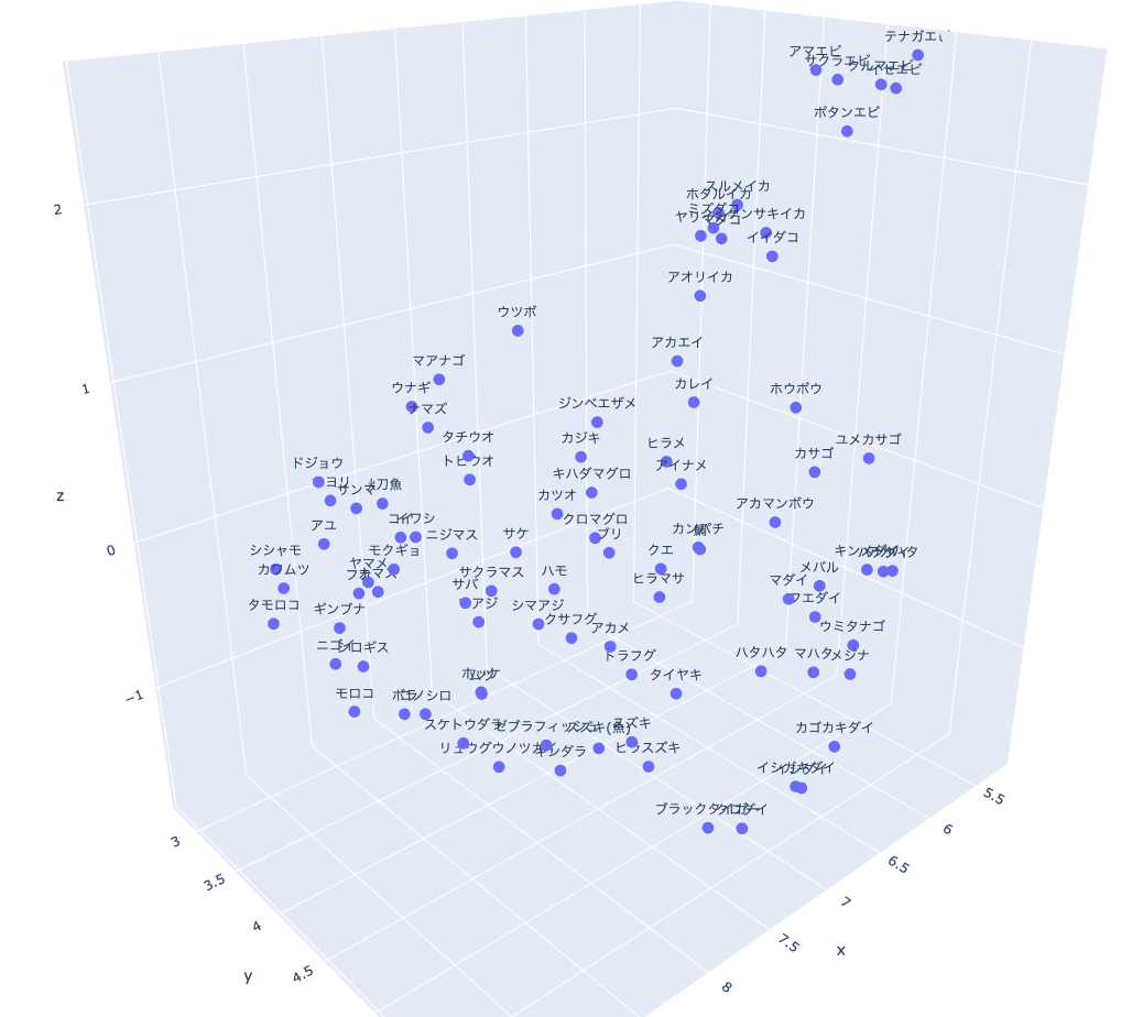ウェビナーでは、約100種の魚名テキストをCLIPによりベクトル化し、UMAPで次元削減して3次元空間に描画し可視化しました。