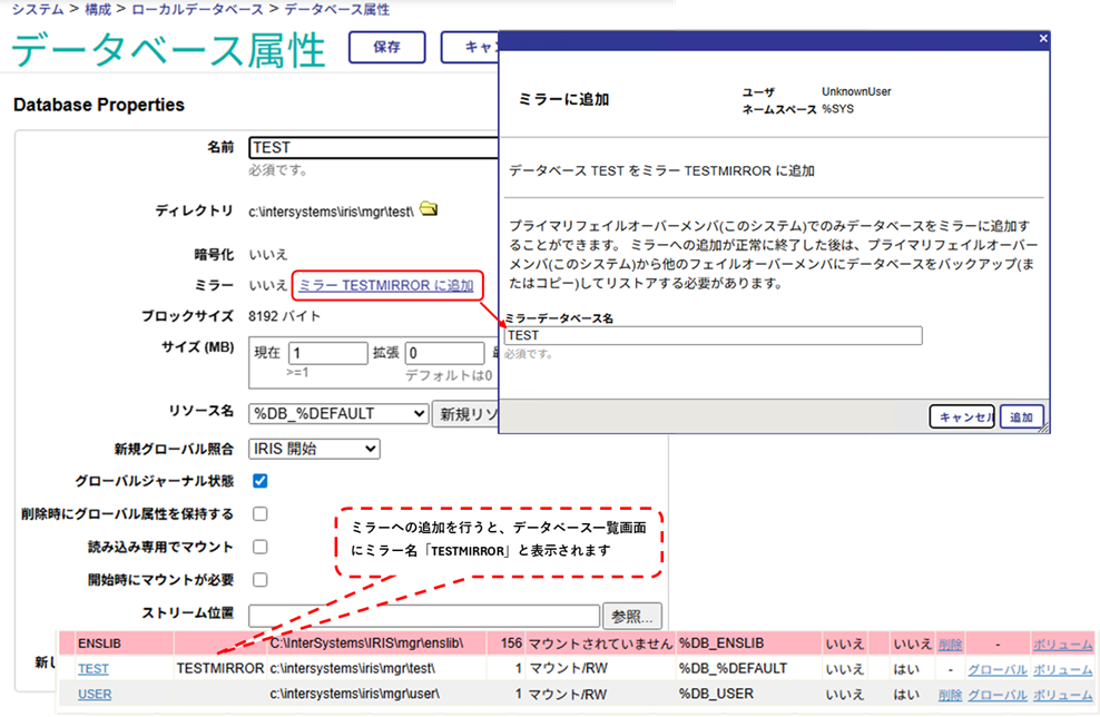TESTMIRROR へ TEST データベースを追加します。ミラーデータベース名には、TEST を使用します。