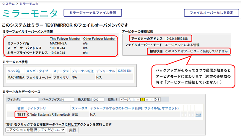 最初に設定したフェールオーバー メンバーで、[ミラー モニター] ページ ( [システム操作] > [ミラー モニター]) を表示