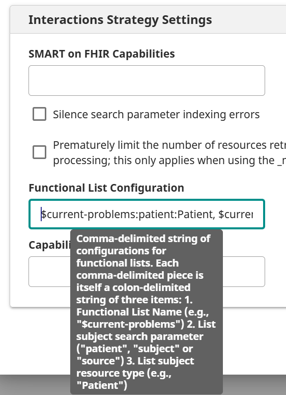機能リスト名の命名については、各リストごとに制御が可能です(各リストのsubject検索パラメータはsubjectリソースタイプは; となります)。例えば上記のサンプルでは、subject 検索パラメータの patient が、subject リソースタイプのPatient)でした)、FHIRエンドポイント設定、具体的には「インタラクション戦略設定」を通じて制御可能であり、詳細は関連ドキュメントはこちらをご参照ください。これは以下のようになります: