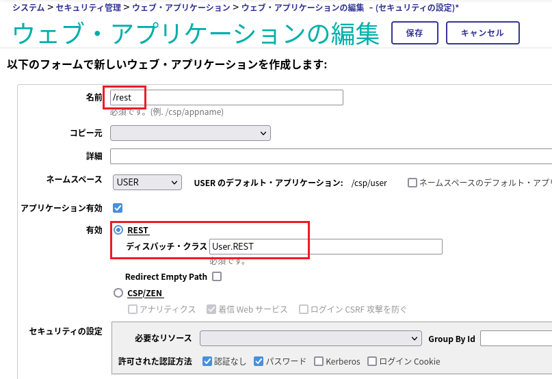 この構成により、IRIS は /rest アプリケーションを対象ネームスペースに転送し、対象ディスパッチクラスを呼び出します。