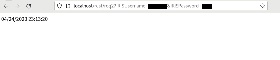 http://localhost/rest/req2?IRISUserName=<UserName>&IRISPassword=<Password>