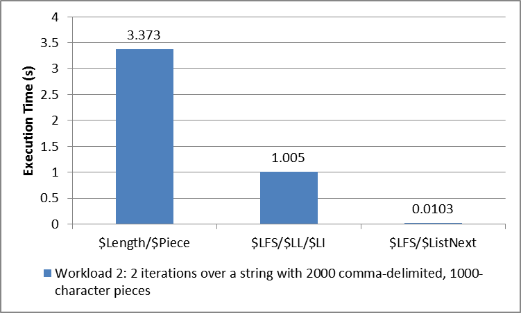 USER>d ##class(DC.LoopPerformance).Run(10000,20,100) Iterating 10000 times over all the pieces of a string with 100 ,-delimited pieces of length 20: Using $Length/$Piece (hardcoded delimiter): .657383 seconds Using $Length/$Piece: 1.083932 seconds Using $ListFromString/$ListLength/$List (hardcoded delimiter): .189867 seconds Using $ListFromString/$ListLength/$List: .189938 seconds Using $ListFromString/$ListNext (hardcoded delimiter): .089618 seconds Using $ListFromString/$ListNext: .089242 seconds Using $Order over an equivalent local array with integer subscripts: .072485 seconds **************************************************** Using $ListFromString/$ListNext (not including conversion to $ListBuild list): .058329 seconds Using one-argument $Order over an equivalent local array with integer subscripts: .060327 seconds Using three-argument $Order over an equivalent local array with integer subscripts: .069508 seconds USER>d ##class(DC.LoopPerformance).Run(2,1000,2000) Iterating 2 times over all the pieces of a string with 2000 ,-delimited pieces of length 1000: Using $Length/$Piece (hardcoded delimiter): 3.372927 seconds Using $Length/$Piece: 11.739316 seconds Using $ListFromString/$ListLength/$List (hardcoded delimiter): 1.004757 seconds Using $ListFromString/$ListLength/$List: .997821 seconds Using $ListFromString/$ListNext (hardcoded delimiter): .010489 seconds Using $ListFromString/$ListNext: .010268 seconds Using $Order over an equivalent local array with integer subscripts: .000839 seconds **************************************************** Using $ListFromString/$ListNext (not including conversion to $ListBuild list): .003053 seconds Using one-argument $Order over an equivalent local array with integer subscripts: .000938 seconds Using three-argument $Order over an equivalent local array with integer subscripts: .000677 seconds