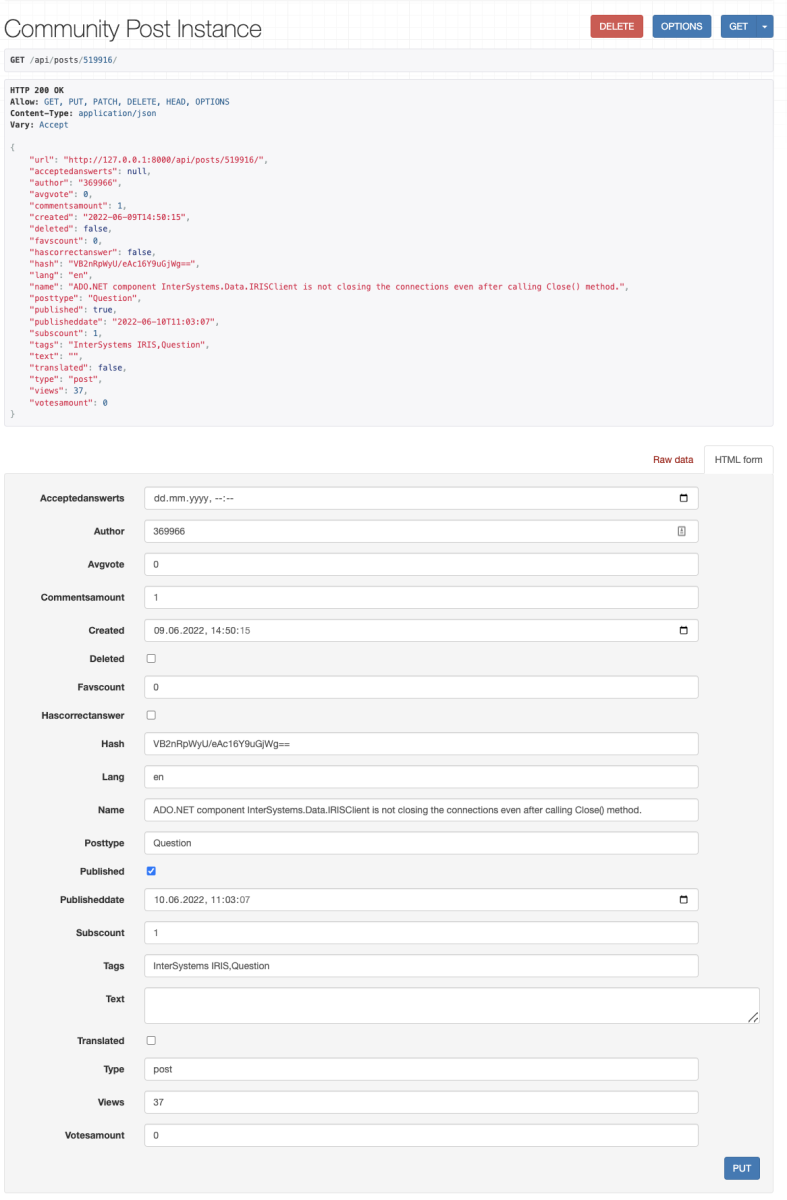 項目リストで任意の項目の URL をクリックして、これを確認します。 レスポンスのこの項目と、PUT リクエストを使った編集フォームのみです。