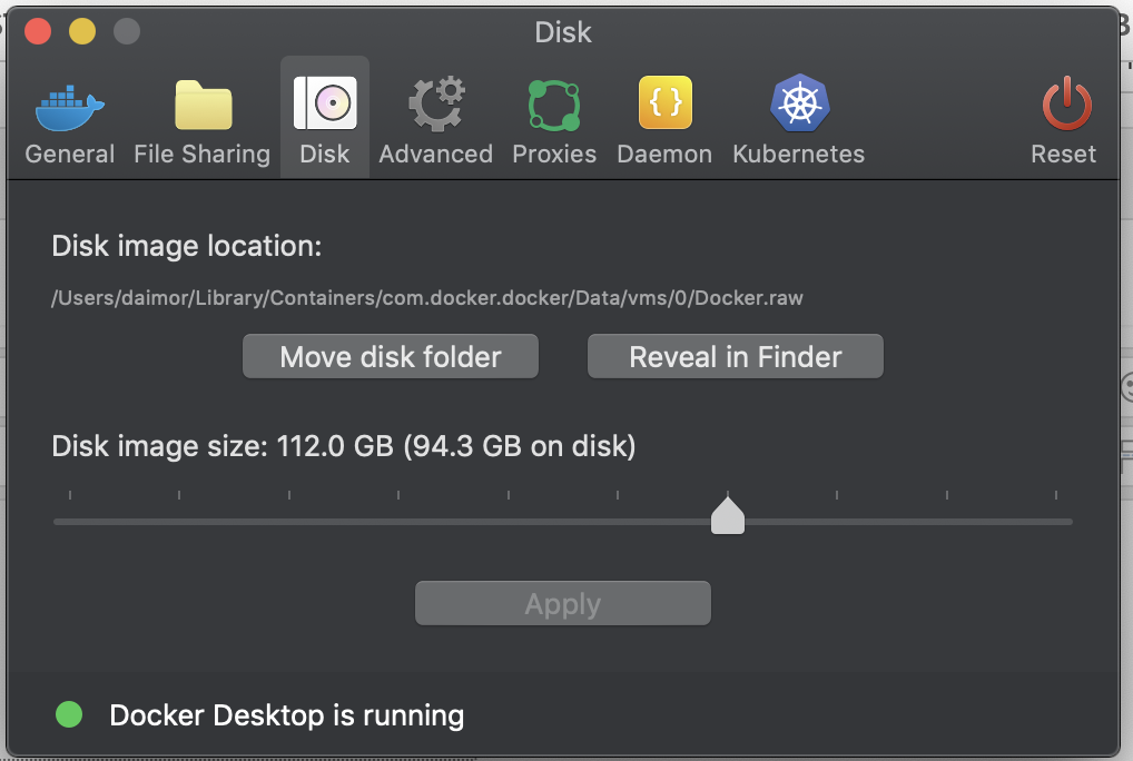 dockerはLinuxに由来しますが、デフォルトで同じファイルシステムで動作します。 ただし、WindowsとmacOSでは、Linuxがインストールされた小さな仮想マシンで動作します。 また、ディスクのスペースはdocker内の設定で制限されています。 私の場合は、最大112GBを使用するように構成されています。