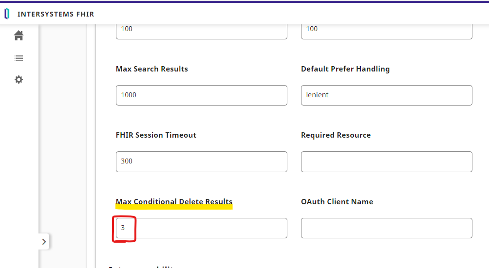 IRIS for HealthのFHIRリポジトリには、「条件付き削除結果の最大数」がデフォルトで3件に設定されています。