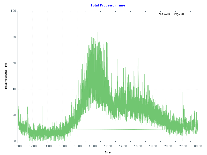 次のグラフは、病院向けアプリケーションを高い処理頻度で実行しているサイトのデータベースサーバーのCPU使用率を示しています。 多くの外来診療所では朝に活動のピークが訪れ、使用率は昼休みに急激に下がり、その後午後から夕方にかけて次第に低下していることが分かります。 この例では、Windowsパフォーマンスモニターの「(_Total)\% Processor Time」(グラフの形状が稼働日の分布測定に適しています)からデータを取得しました。異常な山や谷が見つからないため、このサイトではこのデータは正常であると考えられます。 皆さんもご自身のサイトに対して同じことを行えば、「正常時」のベースラインを取得することができます。 大幅な急上昇、特に異常な急上昇は問題が存在することを示している可能性があります。今後の投稿では、CPUに注目します。