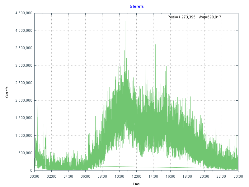 次のグラフでは、CPUのグラフと同じ日のmgstat — Glorefs(グローバル参照)またはデータベースアクセス数のデータをより詳細に示しています。 Glorefsはその時点の負荷を代表するものとして、発生している作業量を示します。グローバルが参照されるとCPU時間が消費されますが、Cachéはグローバルメモリバッファプールを使用しているため、物理的な読み取り操作などの、他のシステムリソースが消費されるとは限りません。
