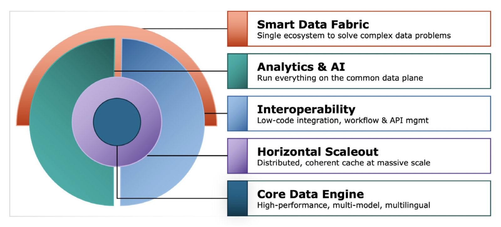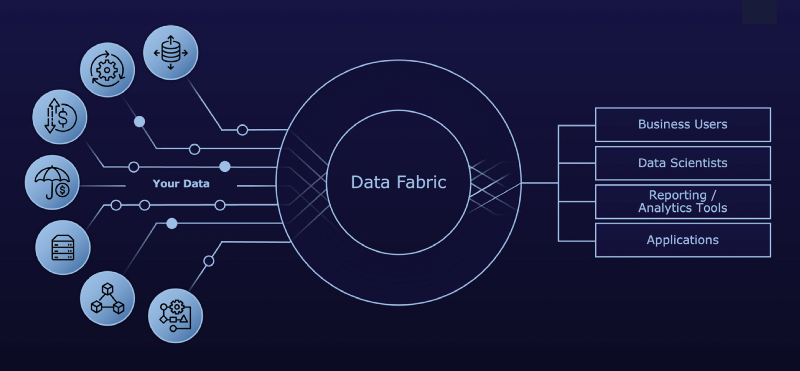 これらの層(中核となるデータエンジン、相互運用性をスケールアウトするためのECP層、そして分析機能)は、当社独自のSmart Data Fabricアーキテクチャを実現する基盤の一部です。データファブリックとは、多様なデータおよびデータソースに対して共通のガバナンスを提供するアーキテクチャパターンです。データファブリックの一般的なパターンとしては、複数のソースからデータを取り込み、データの正規化、デデュプリケーション、相互相関分析、および改善を行い、その後、様々な異なるアプリケーションで利用可能にすることが挙げられます: