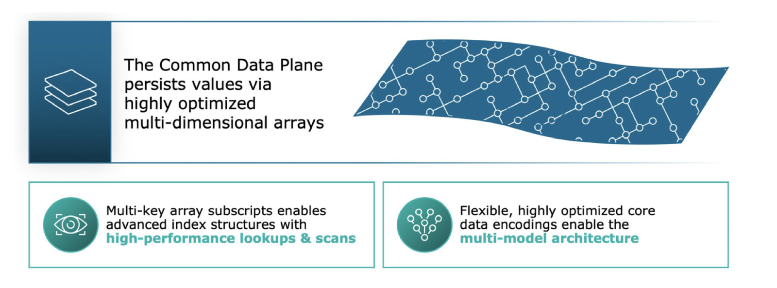 その性能で知られるInterSystemsテクノロジーの中核は、データストア、索引付け、アクセスを実現する極めて効率的な仕組みです。他のデータベースプロバイダーとは異なり、ネイティブのリレーショナルデータベースやドキュメントデータベースを提供しておりません。当社ではグローバルと呼ばれる基盤となるストレージ形式を基盤としております。これらは高度に最適化された多次元アレイ形式でモデル化されており、B+ツリー構造として構築されています。あらゆる操作時に自動的にインデックスが付けられます。InterSystems.comリレーショナル型、オブジェクト型、ドキュメント型などのデータモデルの下位レイヤーに構築された単一のストレージ形式が、様々なデータ形式やモデルへ投影されます。これは統一データプレーンと呼ばれています。