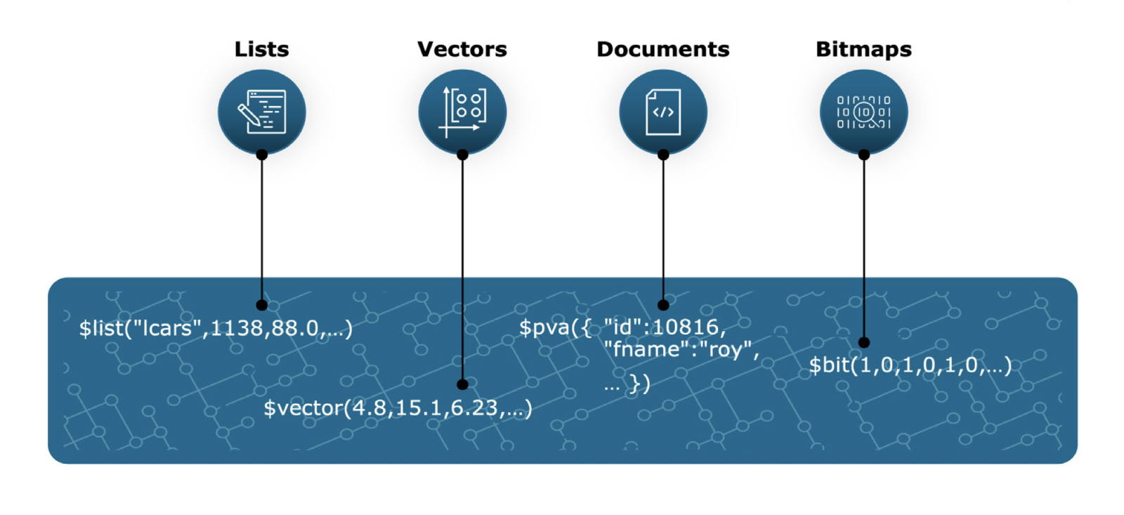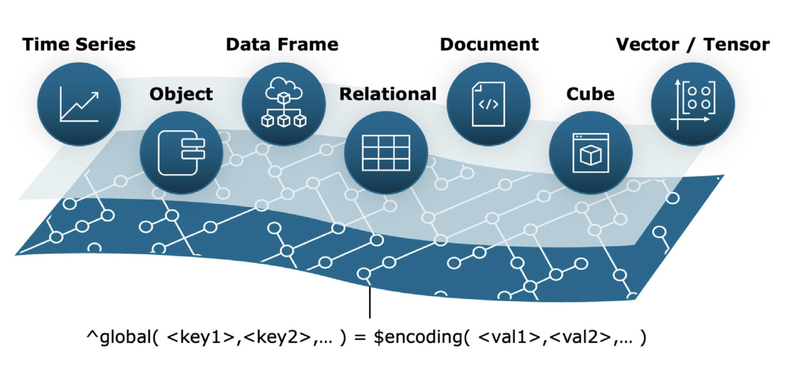 グローバル(上付きキャレットの「^」プレフィックスで示される)は、複数のサブスクリプトを持つことが可能です。各サブスクリプトは数値、英数字、またはシンボリック変数で構成されます。グローバルは強力な機能を持ち、単一のデータコピーで同時に複数データパラダイムをサポートする一般的な方法においてデータを表現します。連想配列やスパース配列のようなケースは、このアプローチで処理しやすいです。また、ストレージ形式自体にエンコーディング(ドル記号「$」プレフィックスで示される)を用いてエンコードします。これにより、ディスクとI/Oの最適化により、小さなフットプリントと低いレイテンシを実現しています。これらのエンコーディングの形式は、メモリ上、ディスク上、あるいはワイヤ上でも同一です。これにより、データ取り込みに伴う変換を最小限に抑え、インメモリデータベースに期待される驚異的な速度を実現しつつ、ディスクベースのデータベースに典型的な永続性を維持します。
