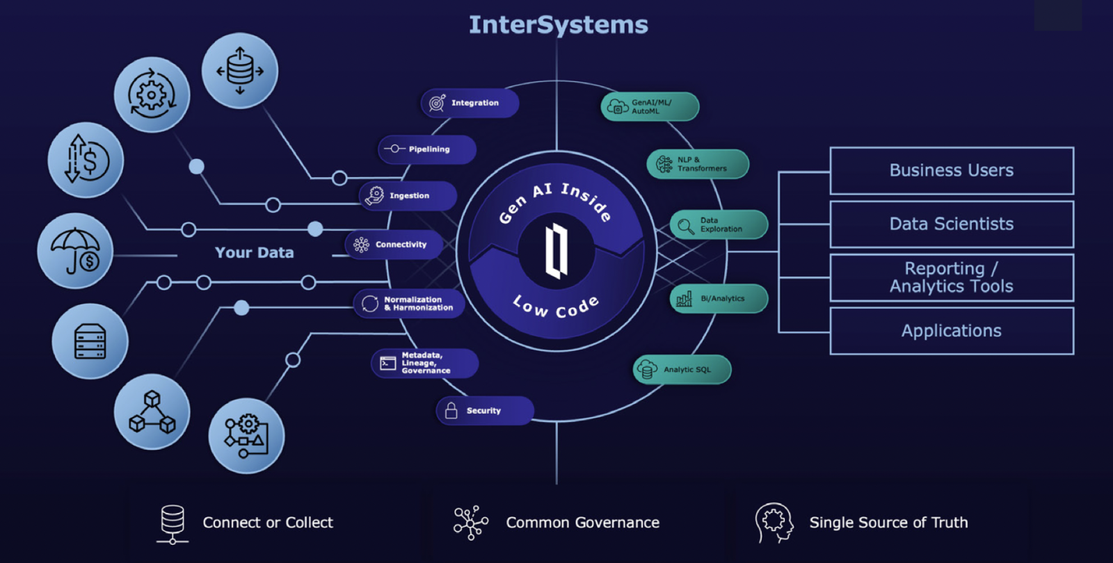 ほとんどのデータファブリックには、データ取り込み、パイプライン処理、メタデータ管理など、複数の機能が備わっています。インターシステムズのアプローチが優れている点は、データファブリック内に分析機能とAIを統合していることです。