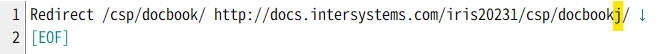 - <IRIS installdir>\httpd\conf\httpd-doc.conf をテキストエディタで開き、Redirect先のURL(右側)を、日本語ドキュメントのもに書き換えて保存する。 具体的には、URLの最後 docbook を、以下のように docbookj に変更する。
