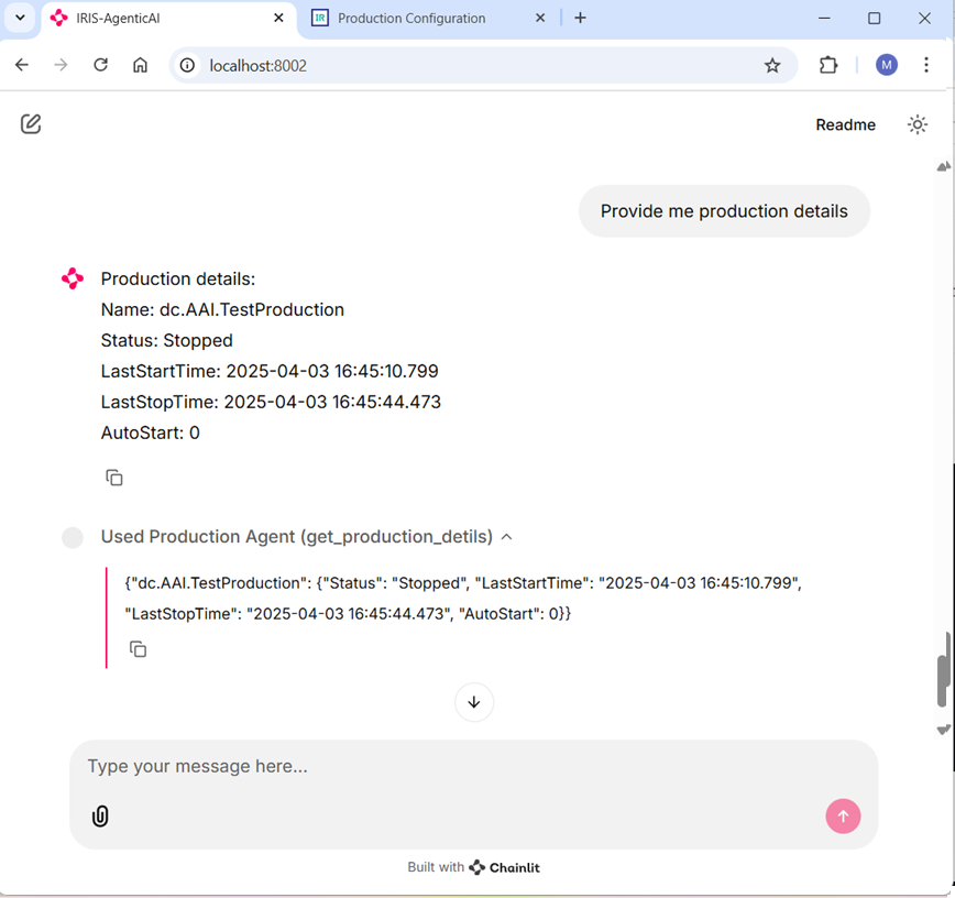 Triage エージェントはユーザー入力を受け取って、質問を IRIS Processes エージェントに転送します。