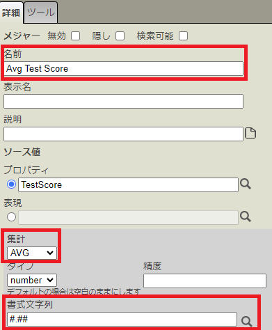 さらに、TestScoreの平均値を示すメジャーも追加します。再びTestScoreをメジャーにドラッグ&ドロップし、作成された TestScore1 の設定を以下のように変更します。