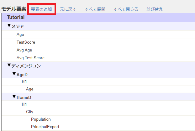 HomeCity 配下の Population と PrincipalExport を、Cityレベルの上にドラッグ&ドロップします。PrincipalExport の名前は Principal Export と変更します。