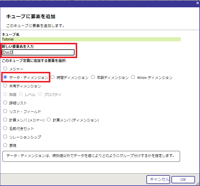 - このキューブ定義に追加する要素を選択:データ・ディメンジョン