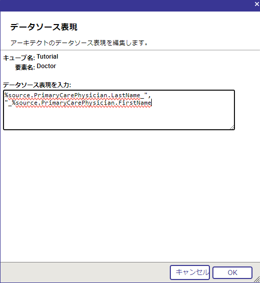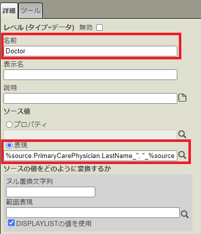 このラベルの設定を変更します。名前は Doctor とし、ソース値のところは [表現] を選択して、以下の式を貼り付けます。苗字(LastName)と名前(FirstName)をカンマ付きで連結してますね。