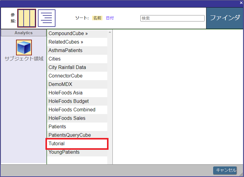 モデル・コンテンツ領域左上のキューブアイコンをクリックし、キューブ選択のダイアログを開きます。