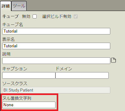 モデル・ビューワ領域に表示されている Tutorial(いちばん上)をクリックし、詳細ペインの [ヌル置換文字列] に None を指定します。