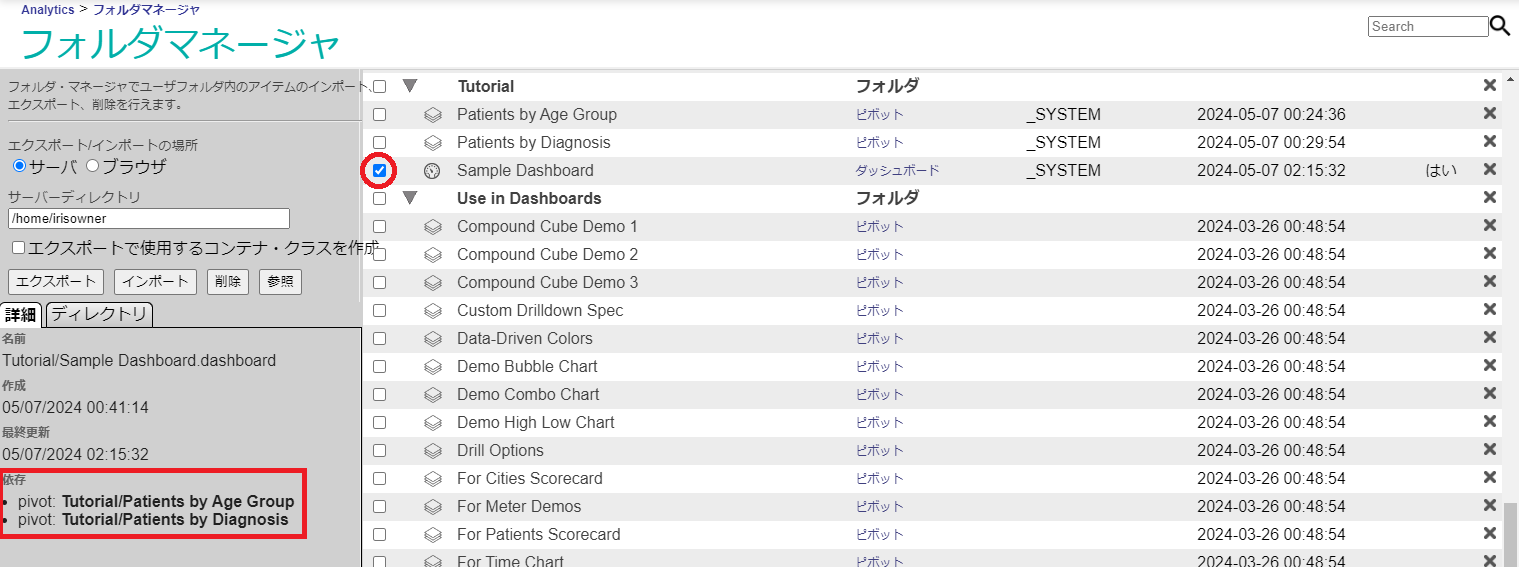 では、この一覧にある Sample Dashboard の左側にあるチェックボックスにチェックを付けます。画面左側の [詳細] の表示が変わります。