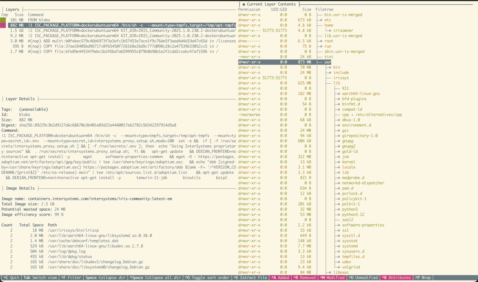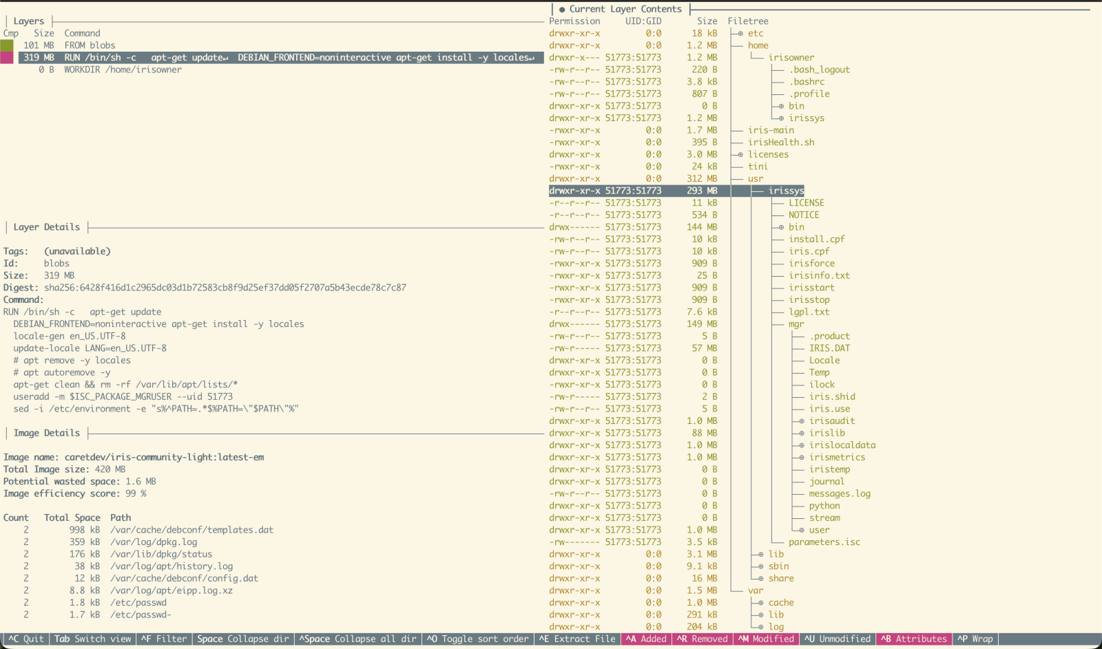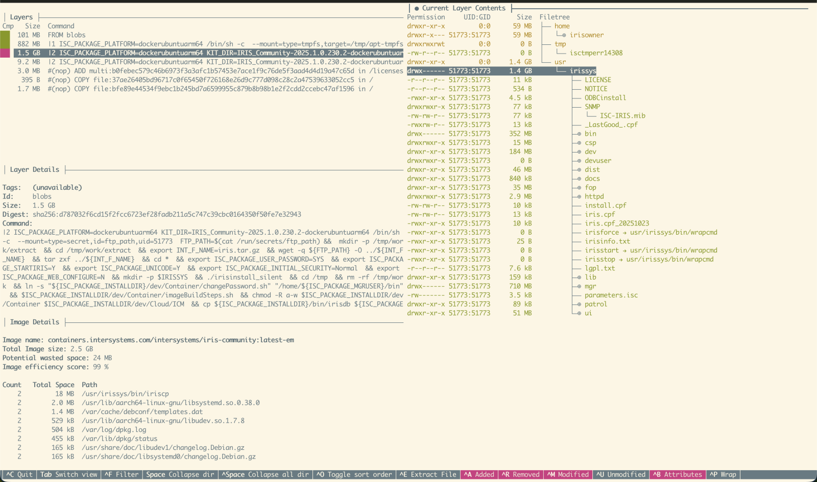 IRIS Community Editionイメージを理解し最適化するため、以下のURLを検証しました:dive。これらはDockerイメージの層を検査し、非効率性を特定するためのツールです。