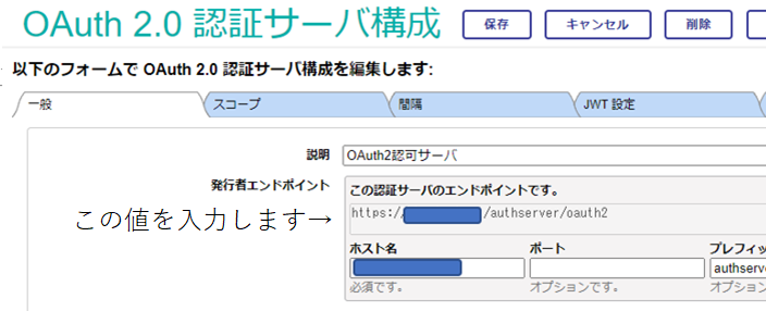 サーバデスクリプション ページで発行者エンドポイントには、パート1で構成した認可サーバのエンドポイントを入力します。