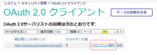 管理ポータルのシステム管理→セキュリティ→OAuth2.0 と進み、前回パート1とは異なり、「サーバ」ではなく、「クライアント」を選択します。